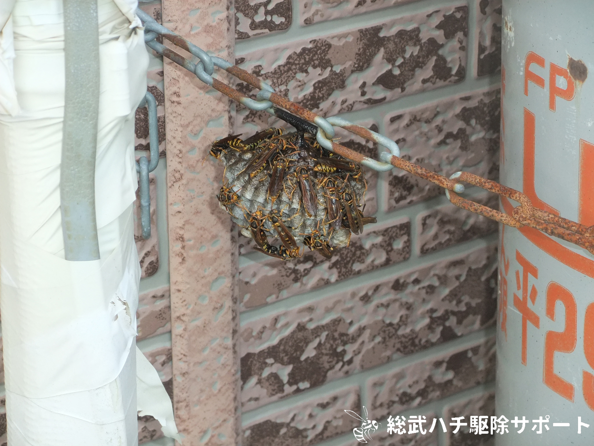 市原市の五井駅周辺でアシナガバチの巣を駆除した時の様子です。お店の裏にあるプロパンガスのボンベを固定している鎖にセグロアシナガバチの巣ができていました。