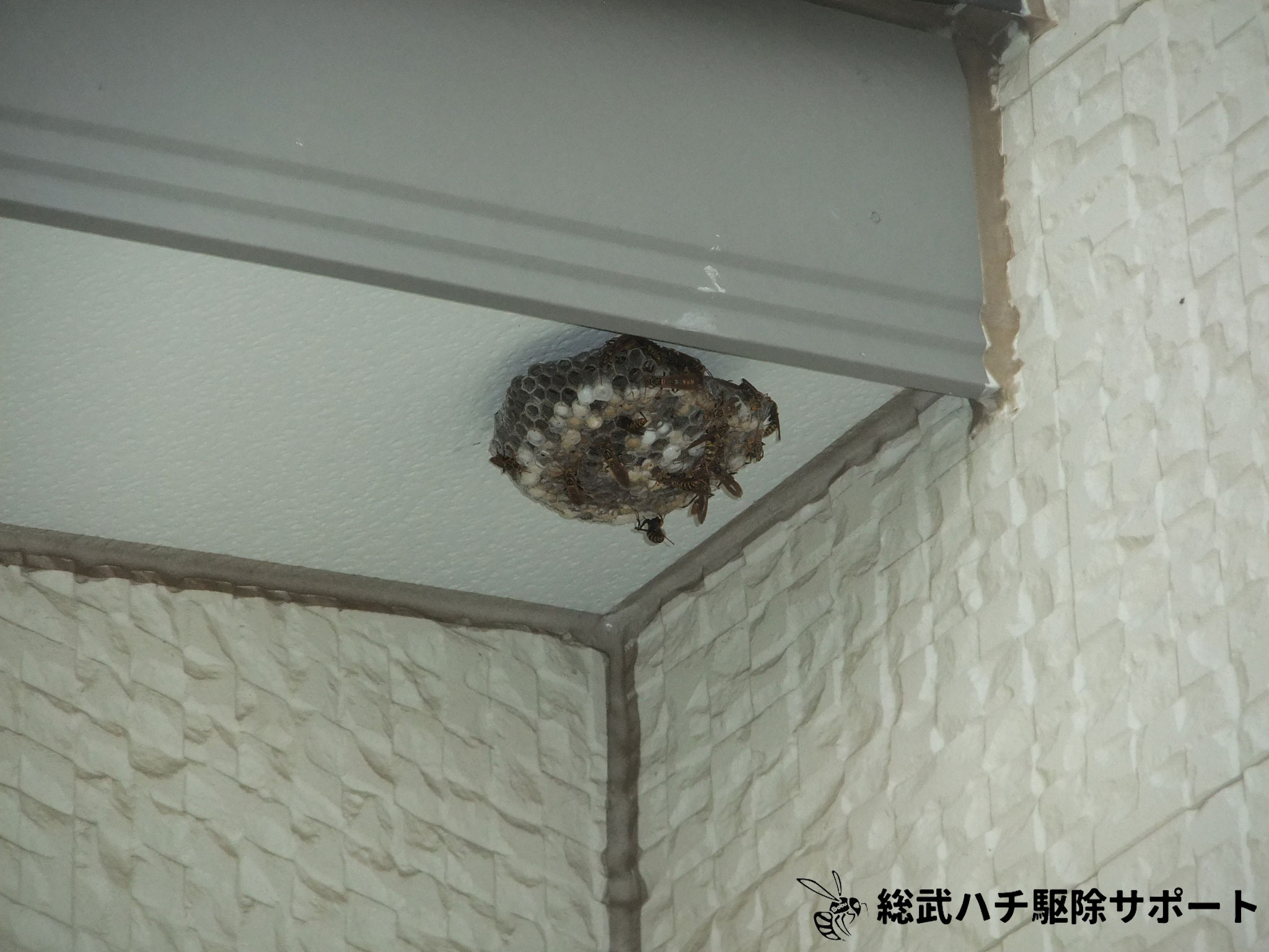 千葉市のみどり台駅周辺の住宅地でアシナガバチの巣を駆除した時の様子です。戸建住宅の軒下部分にセグロアシナガバチの巣ができていました。